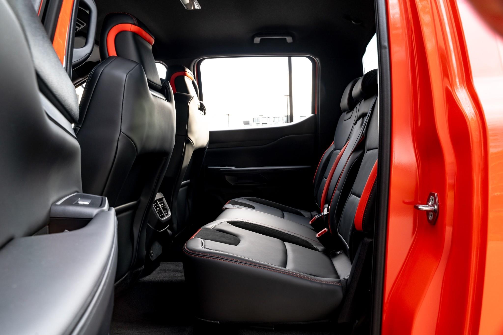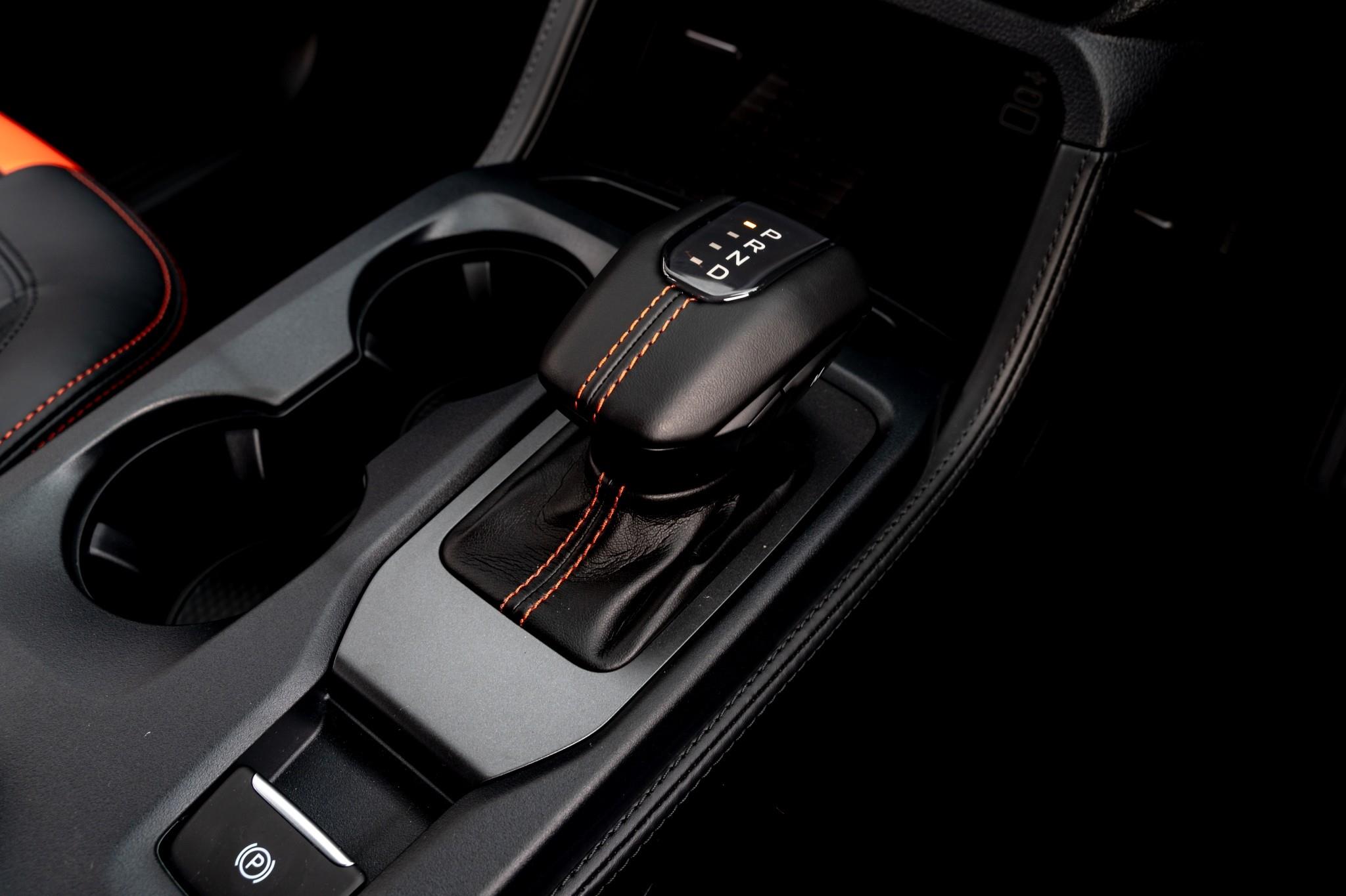 Leather-accented seats with orange stitching